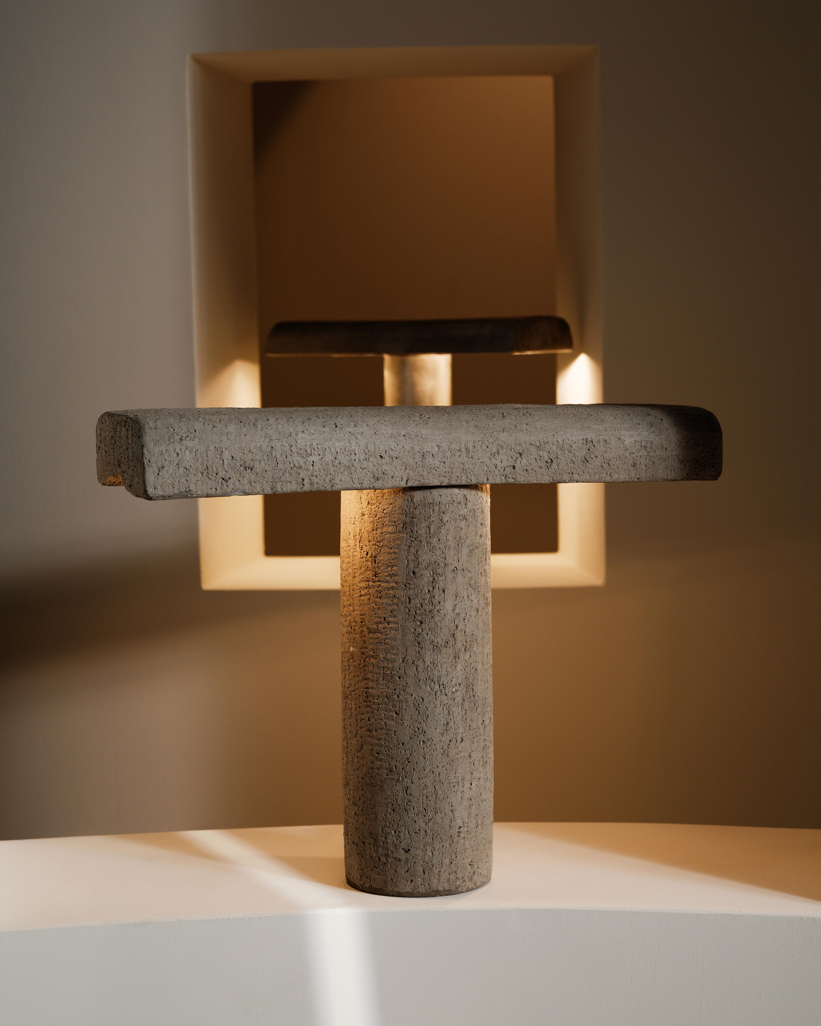 Eenvoudige objecten, bijna vanzelfsprekend, die FCK vooral beschouwt als hulpmiddelen om te leven. De Franse ontwerper Frederick Gautier staat bekend om zijn serene en uitgepuurde objecten in beton, die duidelijk verwijzen naar modernistische en brutalistische architectuur. Zijn verlichtingsontwerpen zetten dit formele onderzoek voort in de huiselijke ruimte. Wat hij het meest waardeert aan het brutalisme is de zuiverheid van de vorm: een constructieve en materiële eerlijkheid. De tafellamp bestaat uit niets meer dan wat noodzakelijk is: één rechte horizontale vorm en één rechte verticale vorm. Een minimaal vocabulaire, bijna vanzelfsprekend. Dankzij het gebruik van beton en aluminium behoudt de lamp een bijzonder sobere en licht ruwe textuur, die sterk contrasteert met de huiselijke warmte van de woonkamer. Ze brengt een rustige, structurerende architecturale aanwezigheid in het interieur.