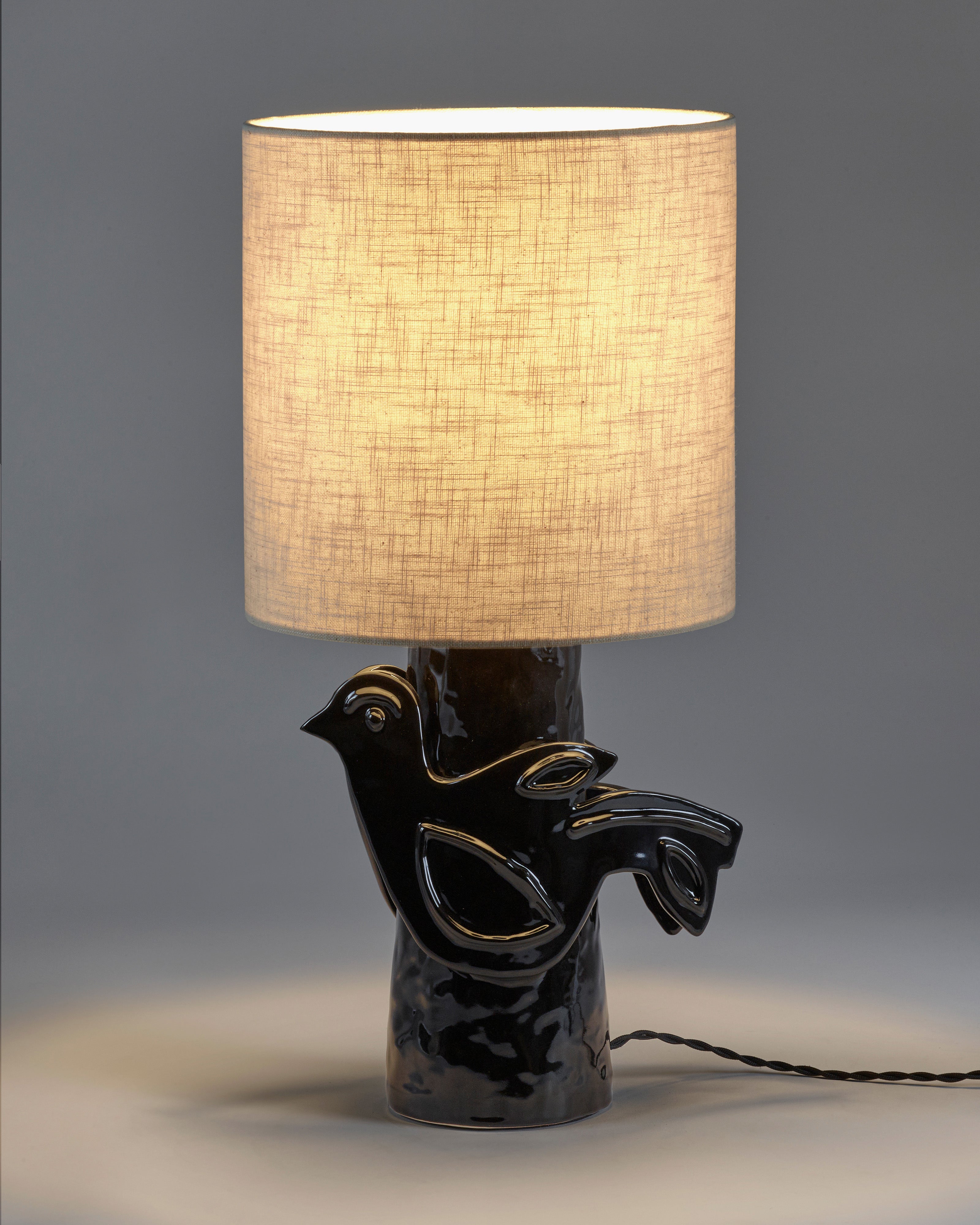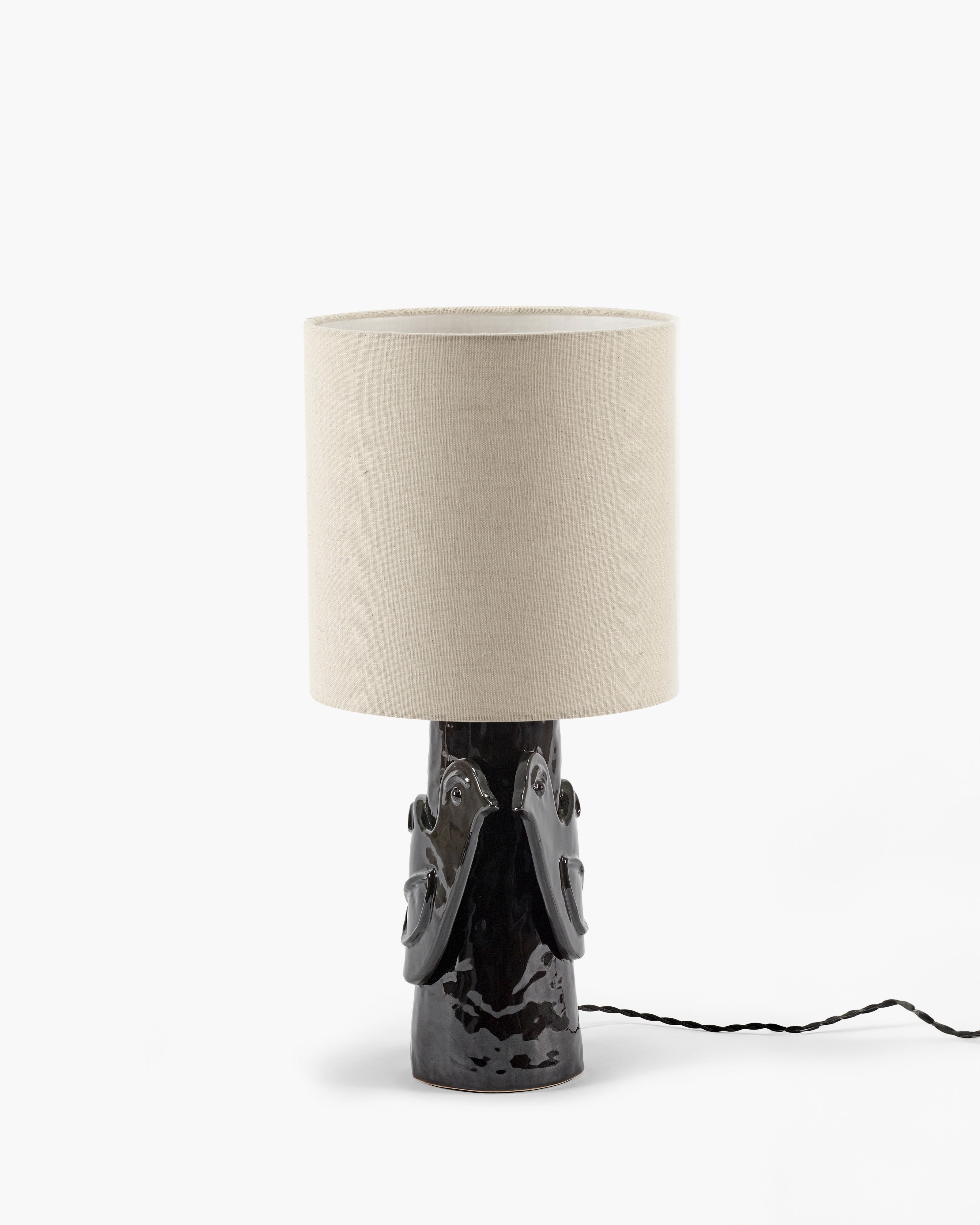 Paloma, een klassieke sfeerlamp, heeft een opvallende voet en een neutrale linnen lampenkap. De voet is versierd met een handgeboetseerde duif, een tijdloos symbool van vrede en voorspoed, dat doet denken aan Picasso's schetsen. De lamp is vernoemd naar Picasso's dochter, Paloma. Marie koos opnieuw voor de drie kleuren die ze eerder voor haar keramiek gebruikte: diep, bijna zwartbruin, warm rood en de natuurlijke kleur van klei met een kleurloos glazuur. Het snoer, met gedraaide geweven stof in zwart of wit, voegt een elegant detail toe aan de lamp.